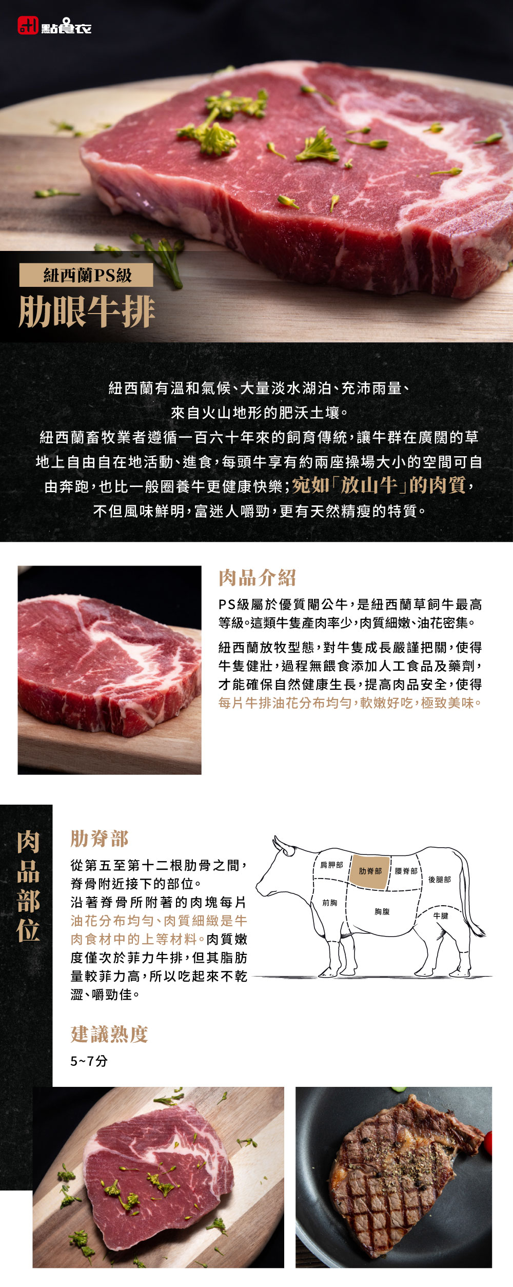 S級屬於優質閹公牛,是紐西蘭草飼牛最高等級。這類牛隻產肉率少,肉質細嫩、油花密集。從第五至第十二根肋骨之間,脊骨附近切下的部位。 沿著脊骨所附著的肉塊每片油花分布均勻、肉質細嫩是牛肉食材中的上等材料。肉質嫩度僅次於菲力牛排,但其脂肪量較菲力高,所以吃起來較不乾澀、嚼勁佳,處理時按肉紋纖維切成牛排,能享受到最佳的嚼感。建議熟度︰5至7分熟。