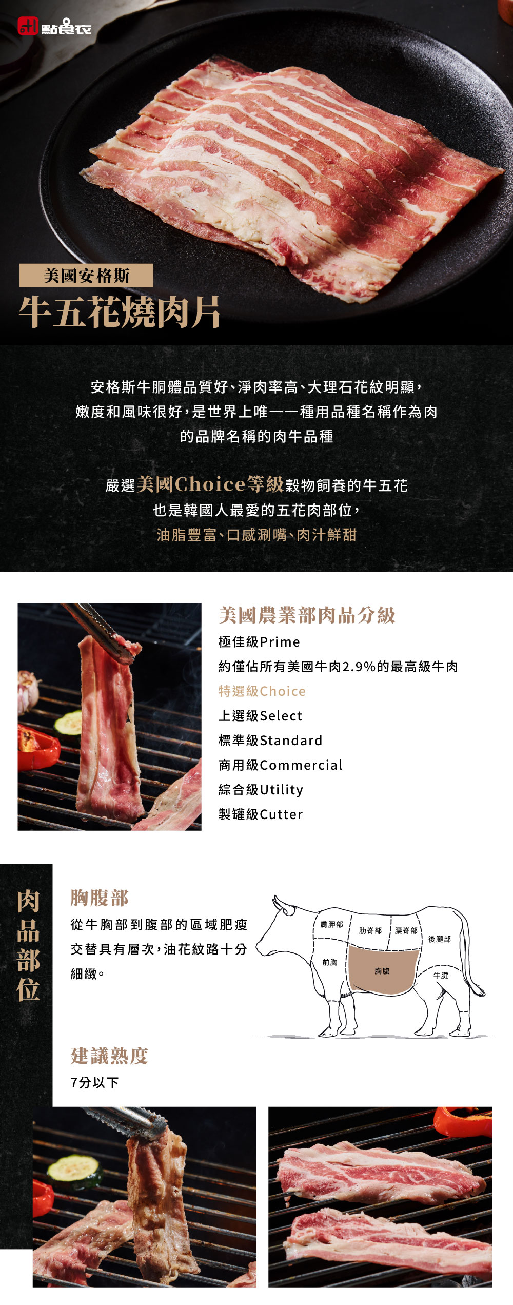 安格斯牛胴體品質好、淨肉率高、大理石花紋明顯,嫩度和風味很好,是世界上唯一一種用品種名稱作為肉的品牌名稱的肉牛品種,嚴選美國Choice等級穀物飼養的五花肉,油脂豐富、口感涮嘴、肉汁鮮甜。油脂的香氣令人難以抗拒,口感豐富且不柴不膩。適合燒烤、涮涮鍋、壽喜燒和牛丼飯,簡單的烹調即可上桌。