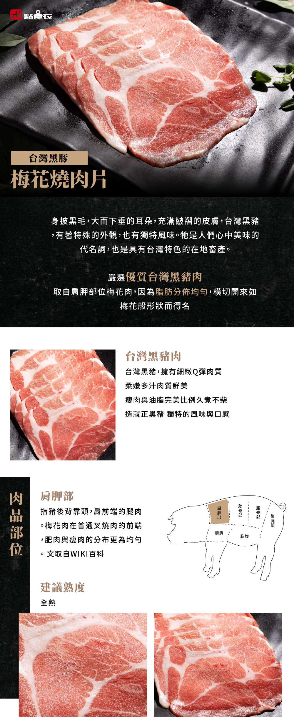 台灣黑豬,擁有細緻Q彈肉質,柔嫩多汁肉質鮮美,瘦肉與油脂完美比例,久煮不柴,造就正黑豬獨特的風味與口感。嚴選優質豬肉,取自肩胛部位梅花肉位於豬隻上肩部份,因為脂肪分佈均勻,橫切開來如梅花般形狀而得名