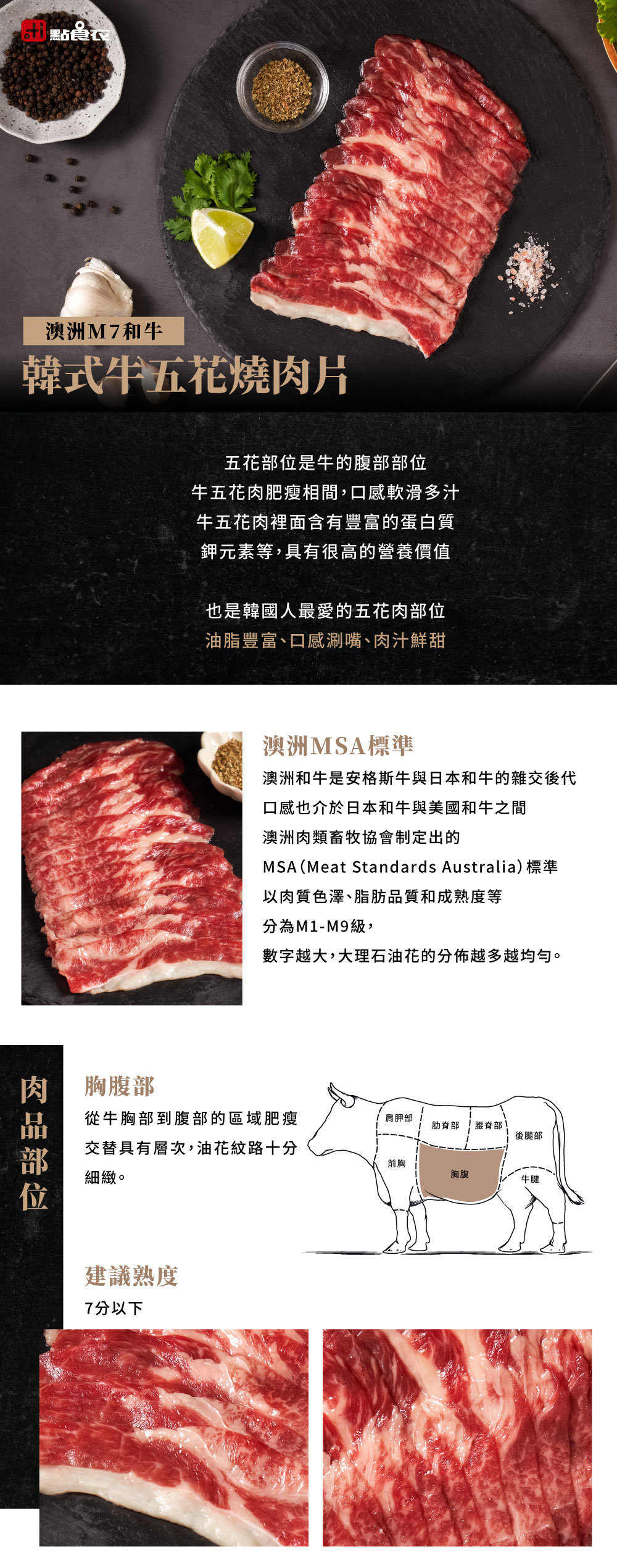 澳洲牛肉是依照MLA機構 (澳洲肉類畜牧協會Meat & Livestock Australia) 制定出的MSA(Meat Standards Australia)標準,以肉質色澤、脂肪品質和成熟度等分為M1-M9級,相當著重大理石油花的分佈比例, 數字越大,大理石油花的分佈越多越均勻,越高級數的牛肉,油花也就越綿密,分佈越平均細緻,肉質便會嫩而多汁,五花部位是牛的腹部部位,牛五花肉肥瘦相間,口感軟滑多汁。 因為牛的腹部脂肪組織比較多,肉質更加細嫩,有彈性,所以牛五花肉的汁水比其他部位的肉的汁水多,適宜烤肉或涮火鍋。 牛五花肉裡面含有豐富的蛋白質,鉀元素等,具有很高的營養價值。