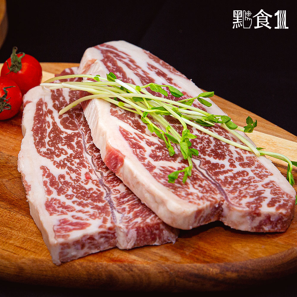嚴選美國Choice等級穀物飼養的去骨牛小排,取自牛的肋脊部位,油脂含量豐富且肉質軟嫩,油紋分布集中且油筋及油脂分布較多,非常適合以炭烤、燒烤的方式料理,將與骨頭連接的筋膜烤得酥脆,是老饕的最愛。
