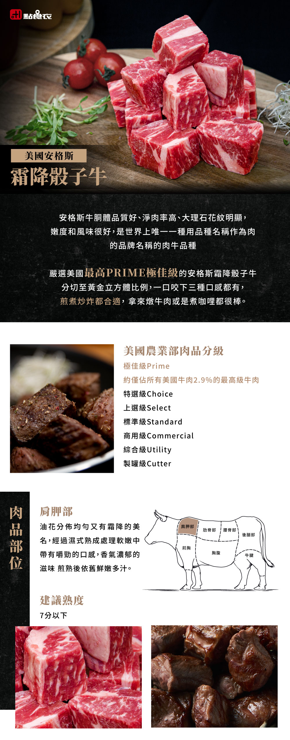 嚴選美國最高PRIME極佳級的安格斯牛肉,約僅有不到2%的牛肉能到得到這個評級,霜降骰子牛肉取自牛肩胛部, 肩胛部肉質緊實又富含油花及些許筋,分切至黃金立方體比例,一口咬下三種口感都有, 骰子牛適合各式料理, 煎煮炒炸都合適, 拿來燉牛肉或是煮咖哩都很棒。