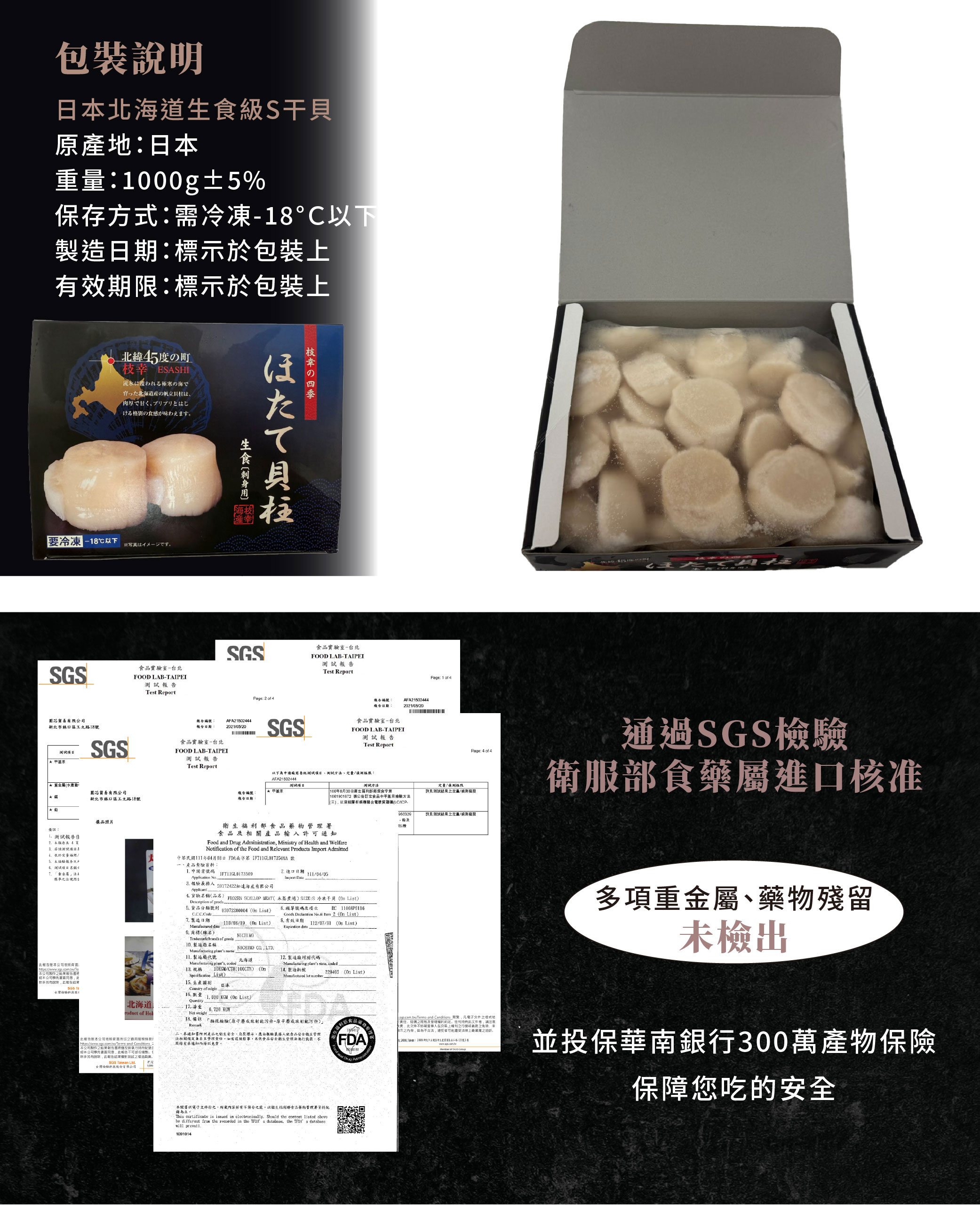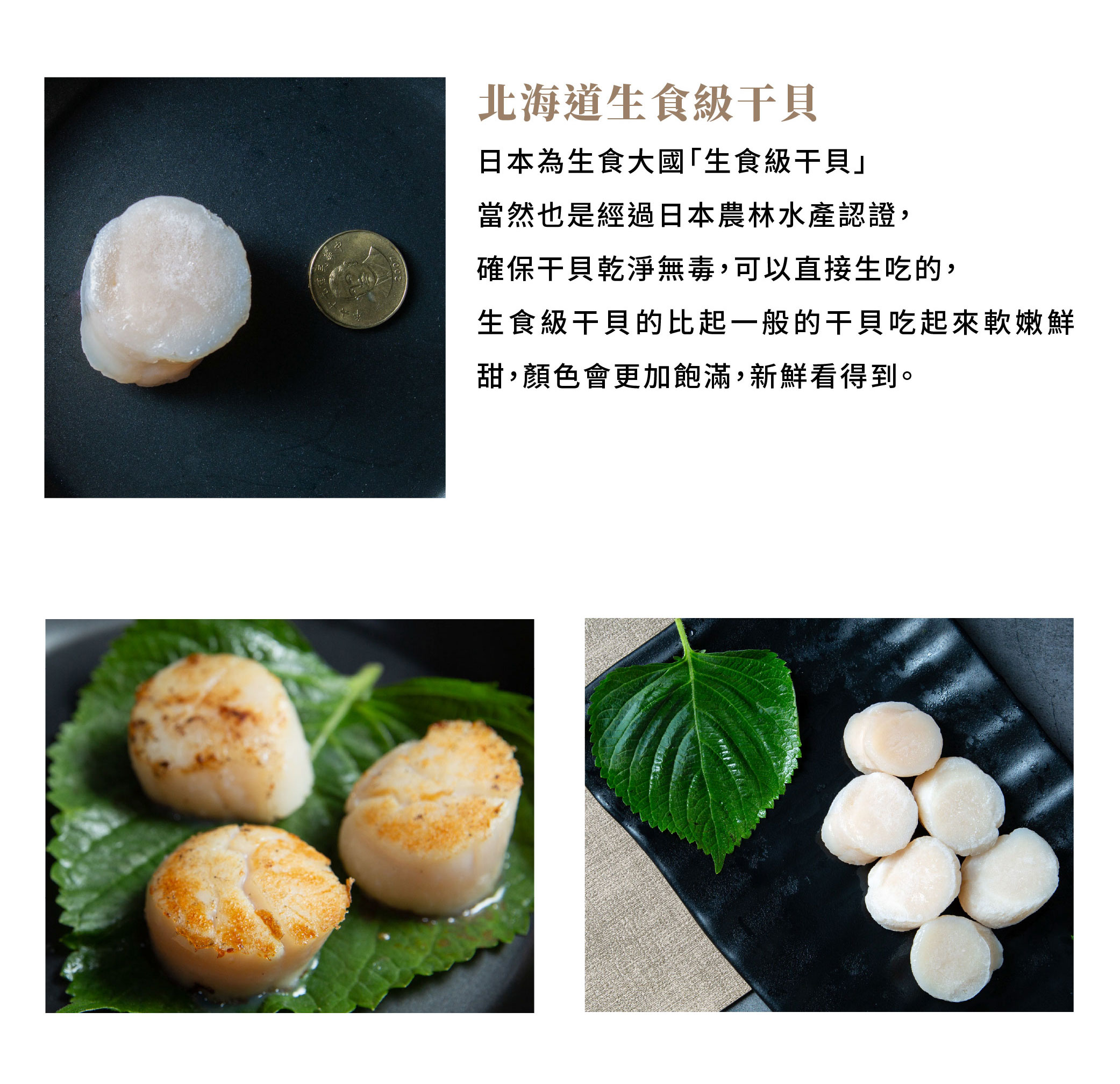 擁有日本協會認證來自北海道的生鮮干貝,肉質成珍珠白色澤,粒粒飽滿厚實。不須再添加任何人工調味料,即可品嘗到他本身肉質軟嫩彈牙的口感及豐富的鮮甜味,是不可錯過的極品食材,直接乾煎就能品嘗鮮甜美味。正宗日本北海道直送來台,厚度比一般干貝厚實,表面龜裂不多 日本料理店生食等級干貝指定品質顆顆飽滿,鮮甜軟嫩的口感,帶有淡淡海味,新鮮採集急凍來台!北海道干貝料理多元,生食刺身或以蒜蓉清蒸、熱炒熬湯、炙燒炭烤、奶油香煎,口感細緻濃郁、絲絲甘甜,滿足味蕾的極品。
