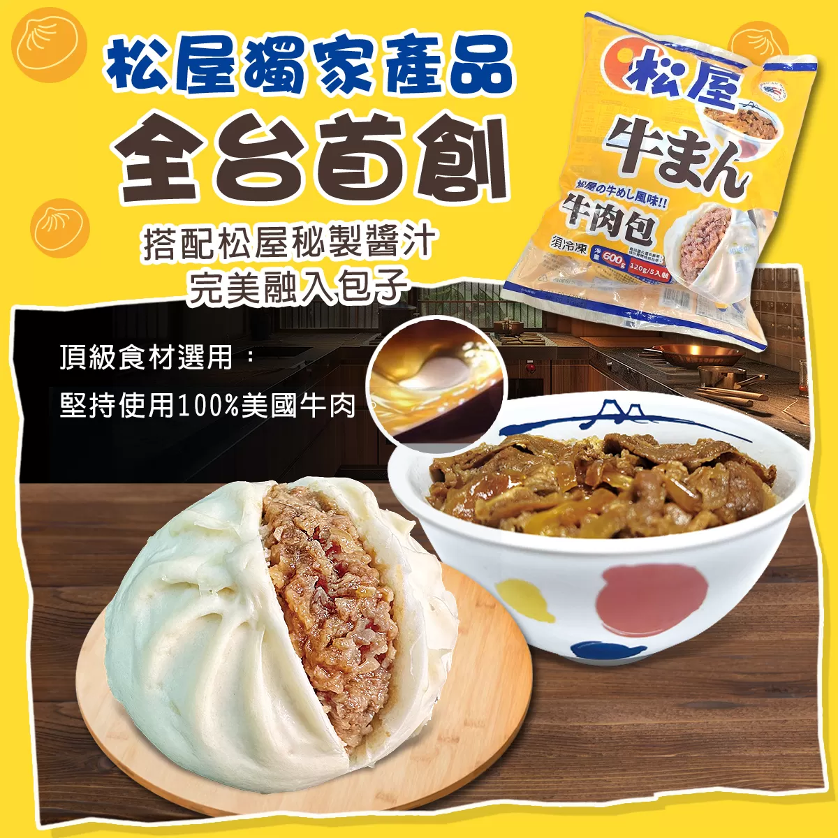 松屋獨家產品,全台首創,每口都是感動與滿足。頂級食材選用:堅持使用 100% 美國牛肉。不使