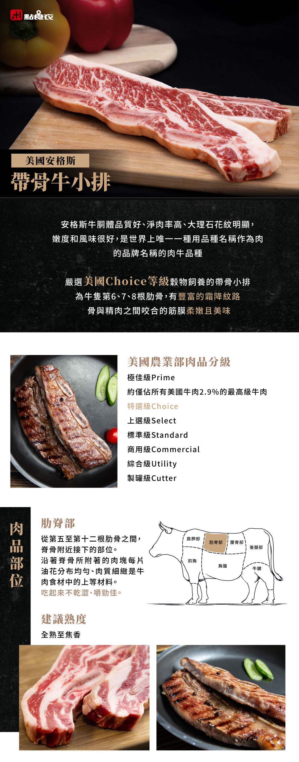 *肉品部位 取自牛隻肋脊部,油脂含量豐富且肉質軟嫩,油紋分布集中且油筋及油脂分布較多,非常適合以炭烤、燒烤的方式料理,是老饕的最愛。