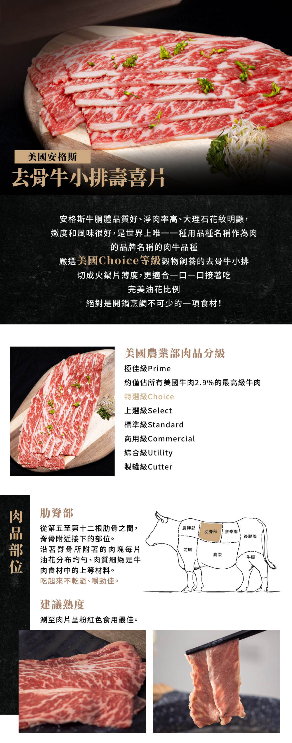 嚴選美國Choice等級穀物飼養的去骨牛小排,取自牛的肋脊部位,油脂含量豐富且肉質軟嫩,油紋分布集中且油筋及油脂分布較多,切成火鍋片薄度,更適合一口一口接著吃,完美油花比例,絕對是開鍋烹調不可少的一項食材!
