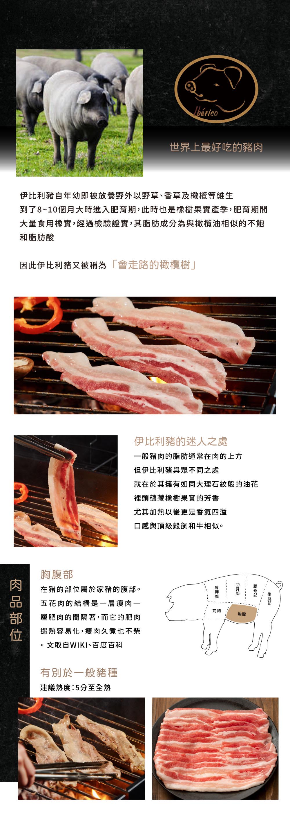 豬肉中最頂級、最鮮甜的肉質就是來自西班牙的伊比利豬。伊比利豬有別於一般的豬種,就是他可以不必烤至全熟,豬梅花取自肩胛部,油花分佈均勻,肥瘦各半,口感鮮嫩,香氣四溢,吃起來不會有豬腥味,還帶有獨特的香氣。