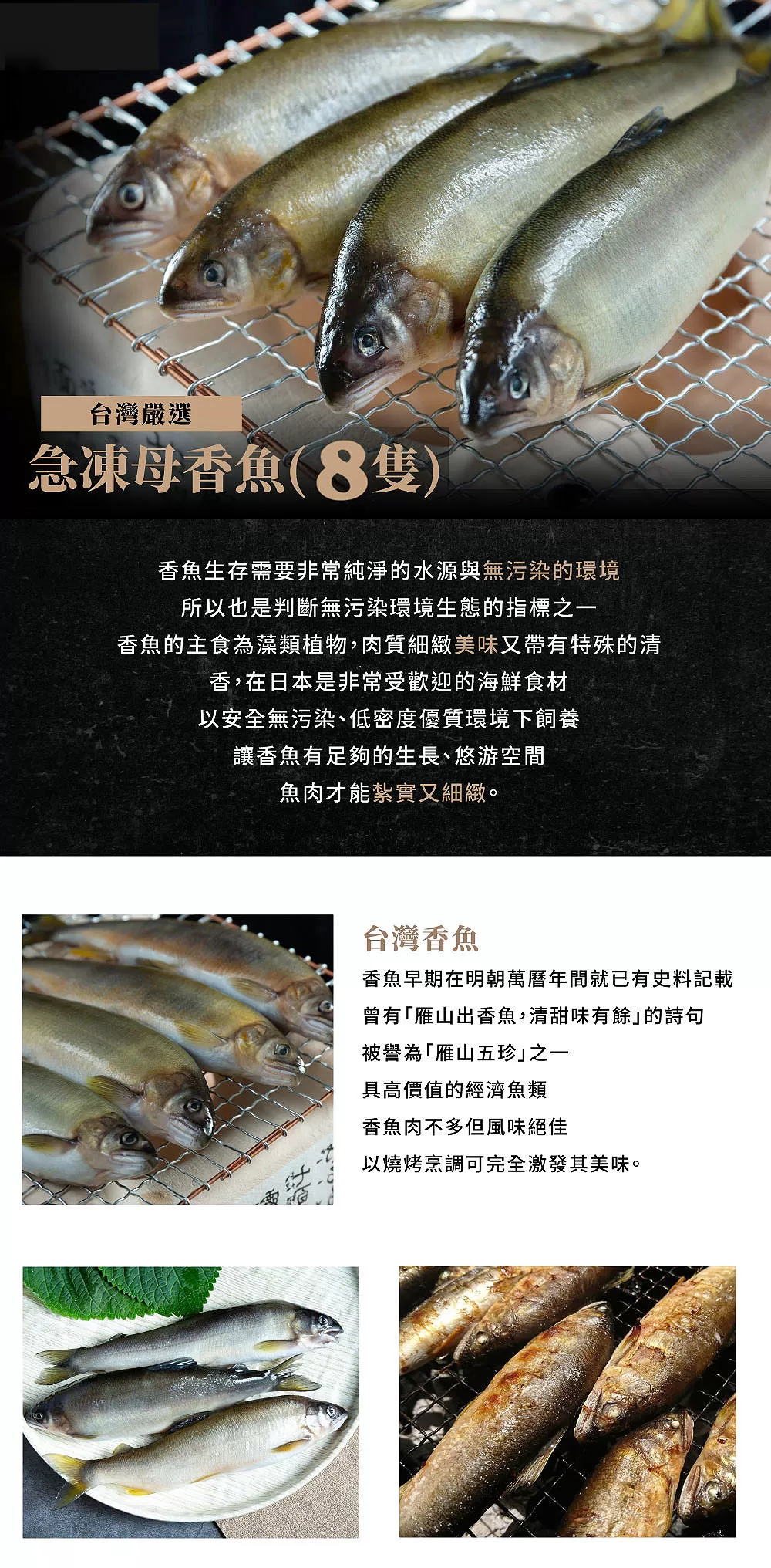 香魚曾在台灣絕種過,後透過日本魚種重新在台灣復育成功,香魚生存需要非常純淨的水源與無污染的環境,所以也是判斷無污染環境生態的指標之一。香魚的主食為藻類植物,肉質細緻美味又帶有特殊的清香,在日本是非常受歡迎的海鮮食材。以安全無污染、低密度優質環境下飼養,讓香魚有足夠的生長、悠游空間,魚肉才能紮實又細緻。母香魚一年只有一次機會能補獲,堪稱極品美味!生長於清澈且無污染的水中,肉質特別鮮嫩肥美有淡水魚之釀的美稱喔!母香魚身體肥嫩 肉質細緻、肉質緊緻豐腴、肥得剛剛好,加上飽滿香Q的魚卵一直都是老饕的最愛,更是日本料理不可或缺的食材,沒有魚腥味,入口後有股淡淡的香味,所以美其名為香魚,被嘴巴超刁的饕客封為『河魚之王』美譽。 香魚不需要繁複的料理法,簡單料理就能吃出美味,更不用去除內臟,以簡單的香煎、鹽烤、酥炸等方式,即可品嚐到香魚的鮮甜和美味。