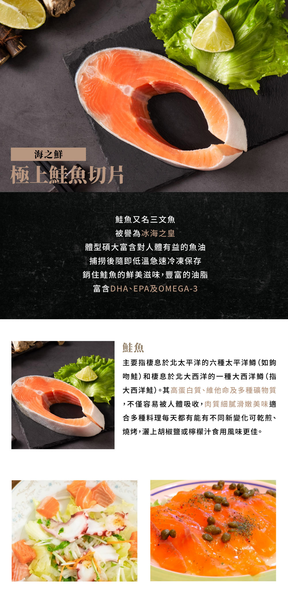 鮭魚又名三文魚,是人類經常食用的數種鮭形目鮭科鮭亞科的通稱,其中主要指棲息於北太平洋的六種太平洋鱒(如鉤吻鮭)和棲息於北大西洋的一種大西洋鱒(指大西洋鮭)。鮭魚又被譽為冰海之皇,體型碩大富含對人體有益的魚油,捕撈後隨即低溫急速冷凍保存,銷住鮭魚的鮮美滋味,豐富的油脂,富含DHA、EPA及OMEGA-3,其高蛋白質、維他命及多種礦物質,不僅容易被人體吸收,肉質細膩滑嫩美味適合多種料理每天都有能有不同新變化可乾煎、燒烤,灑上胡椒鹽或檸檬汁食用風味更佳. 商品特色.。