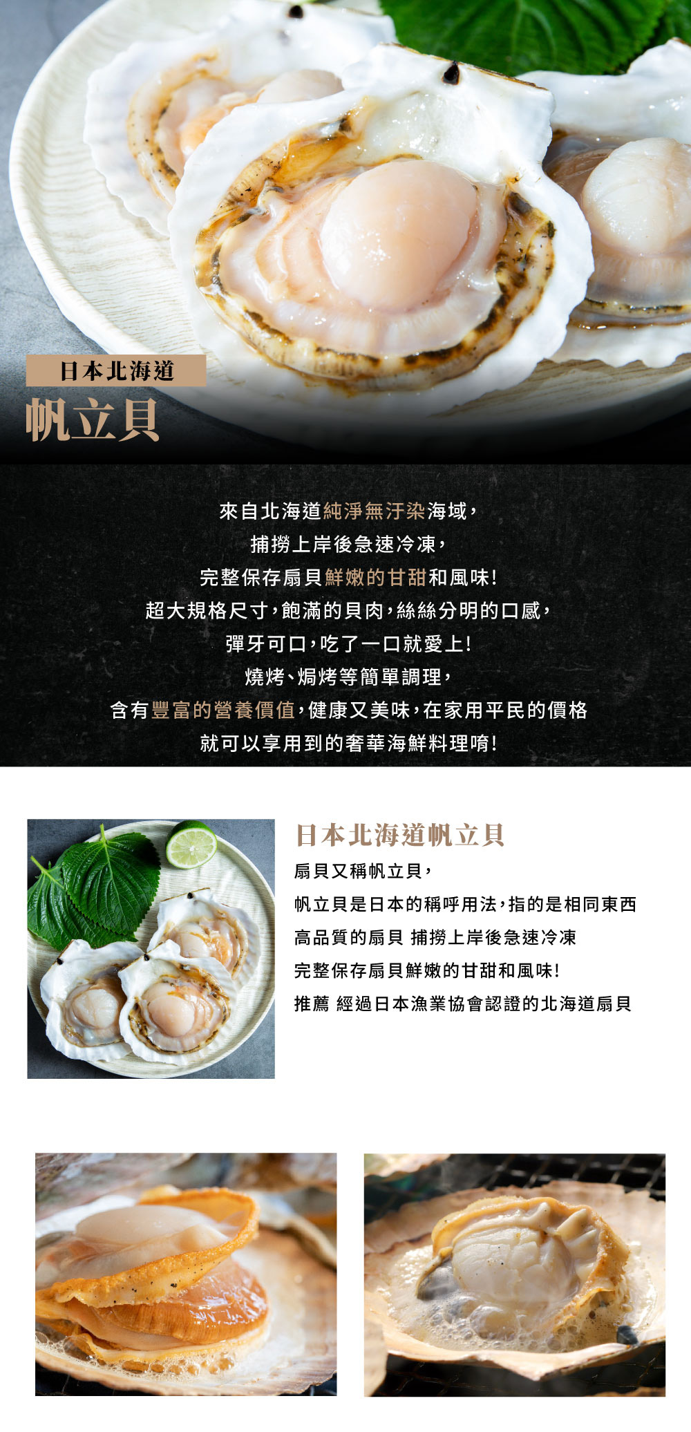 扇貝又稱帆立貝,帆立貝是日本的稱呼用法,指的是相同東西!高品質的扇貝像是有名的北海道帆立貝,北海道扇貝都經過日本漁業協會認證,扇貝來自北海道純淨無汙染海域,捕撈上岸後急速冷凍,完整保存扇貝鮮嫩的甘甜和風味!超大規格尺寸,飽滿的貝肉,絲絲分明的口感,彈牙可口,吃了一口就愛上!燒烤、焗烤等簡單調理,含有豐富的營養價值,健康又美味,在家用平民的價格就可以享用到的奢華海鮮料理唷!