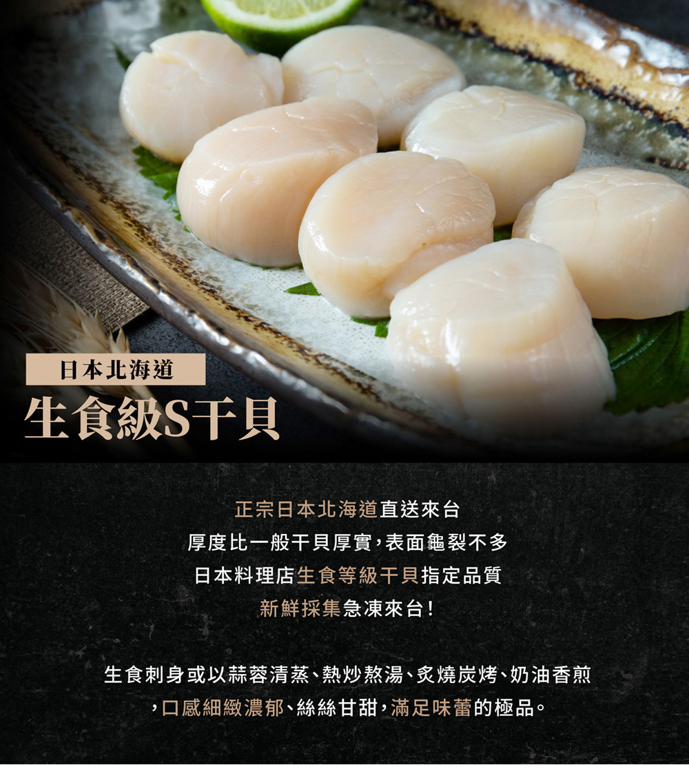 擁有日本協會認證來自北海道的生鮮干貝,肉質成珍珠白色澤,粒粒飽滿厚實。不須再添加任何人工調味料,即可品嘗到他本身肉質軟嫩彈牙的口感及豐富的鮮甜味,是不可錯過的極品食材,直接乾煎就能品嘗鮮甜美味。正宗日本北海道直送來台,厚度比一般干貝厚實,表面龜裂不多 日本料理店生食等級干貝指定品質顆顆飽滿,鮮甜軟嫩的口感,帶有淡淡海味,新鮮採集急凍來台!北海道干貝料理多元,生食刺身或以蒜蓉清蒸、熱炒熬湯、炙燒炭烤、奶油香煎,口感細緻濃郁、絲絲甘甜,滿足味蕾的極品。