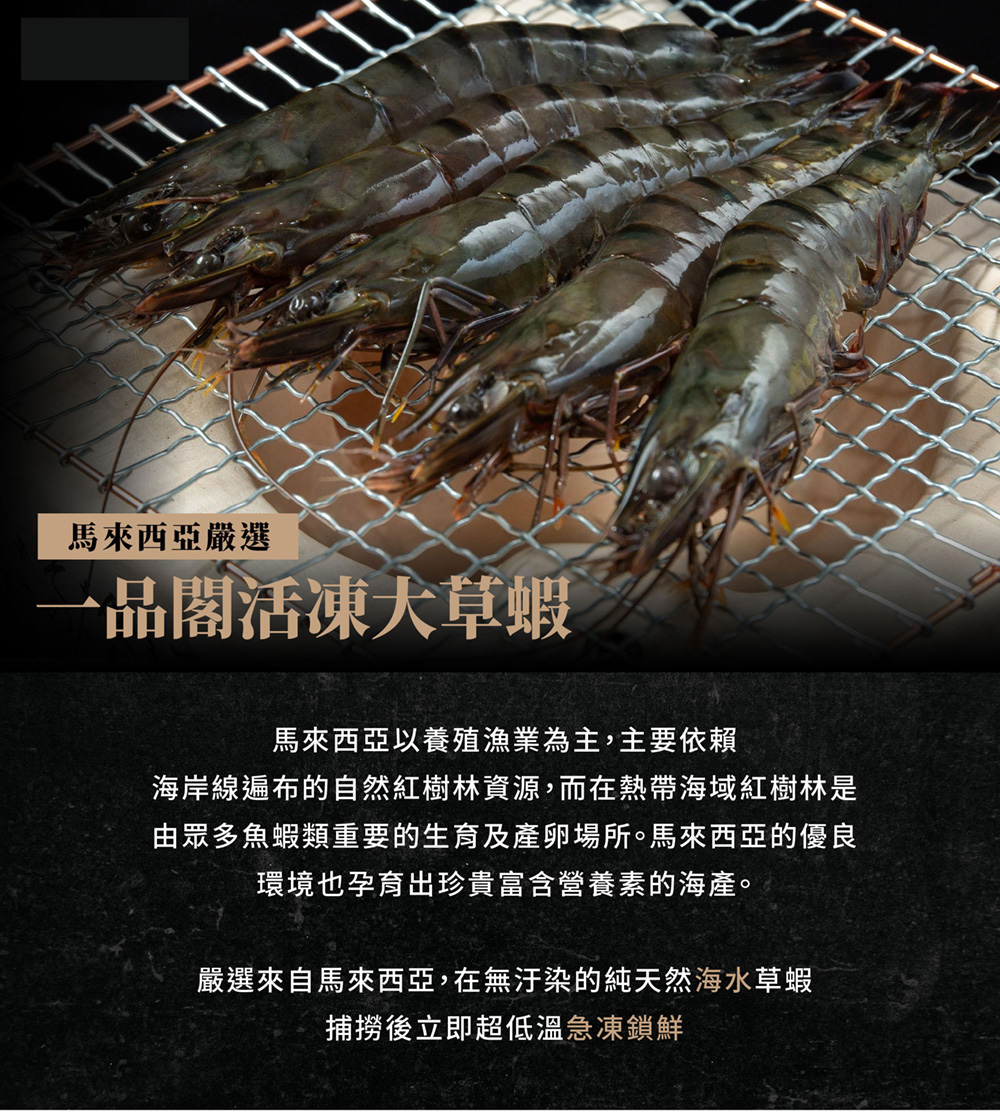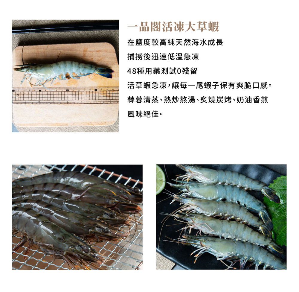 一品閣草蝦 產地馬來西亞養殖的海水濃度較高成本高於越南許多堅持,來自純淨海域的無毒草蝦,在鹽度較高純天然海水成長,口感更加鮮甜,捕撈後迅速低溫急凍48種用藥測試0殘留,無毒,健康,新鮮,美味彈牙,從池邊到冷凍廠,採用活草蝦急凍,並非打冰等待. 讓每一尾蝦子保有爽脆口感。適合料理方式 蒜蓉清蒸、熱炒熬湯、炙燒炭烤、奶油香煎 風味絕佳。