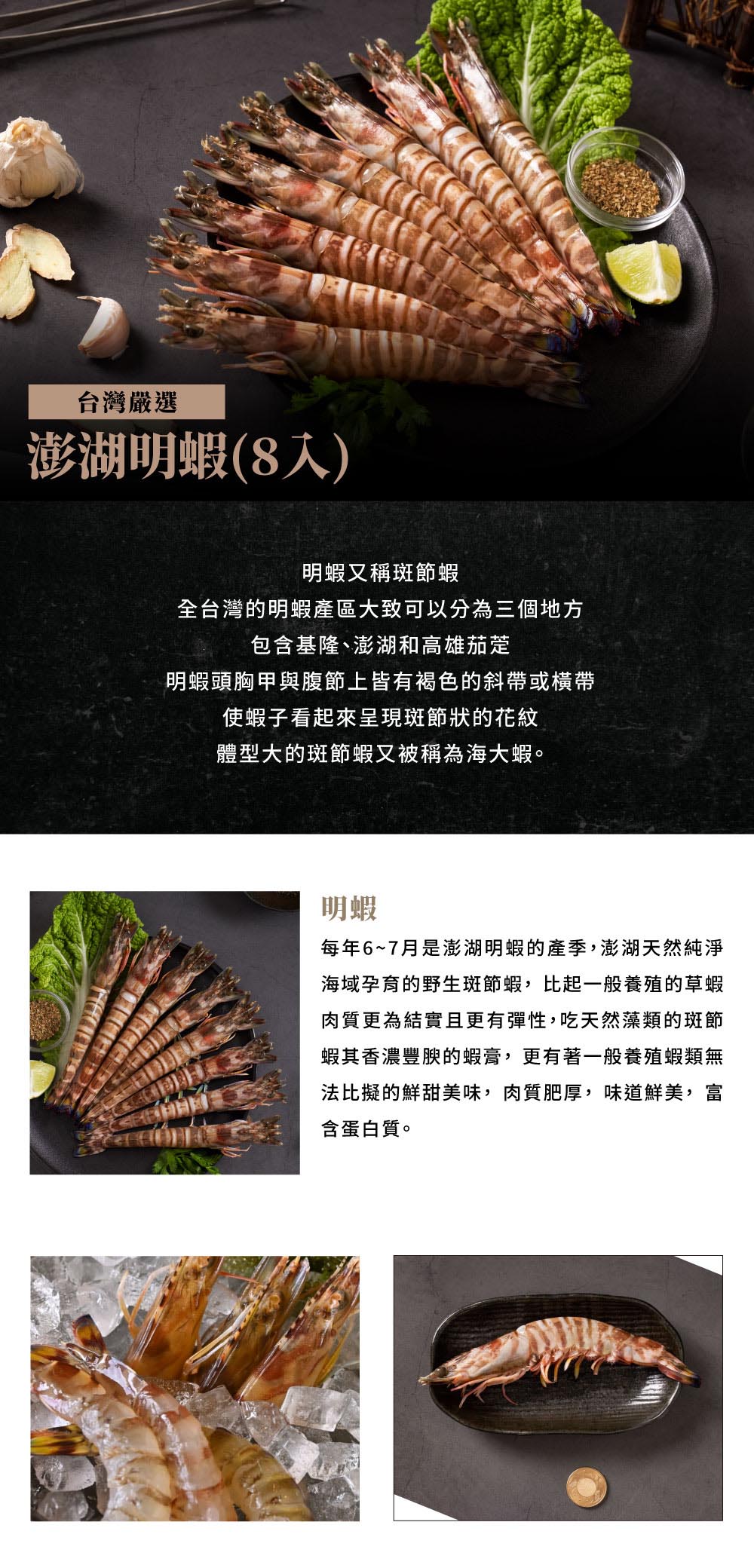 全台灣的明蝦產區大致可以分為三個地方,包含基隆、澎湖和高雄茄萣,頭胸甲與腹節上皆有褐色的斜帶或橫帶,使蝦子看起來呈現斑節狀的花紋,體型大的斑節蝦又被稱為明蝦或海大蝦。每年6~7月是澎湖明蝦的產季,澎湖天然純淨海域孕育的野生斑節蝦, 比起一般養殖的草蝦肉質更為結實且更有彈性,吃天然藻類的斑節蝦其香濃豐腴的蝦膏, 更有著一般養殖蝦類無法比擬的鮮甜美味, 肉質肥厚, 味道鮮美, 富含蛋白質。