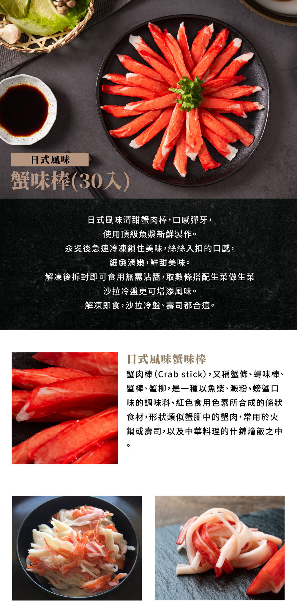 日式風味清甜蟹肉棒,口感彈牙,使用頂級魚漿新鮮製作。