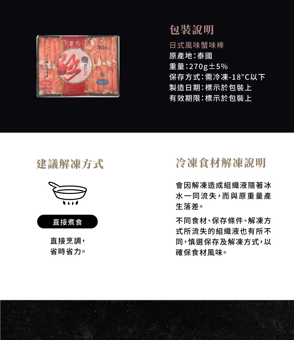 解凍即食,沙拉冷盤、壽司都合適。製造以冷凍金線魚漿